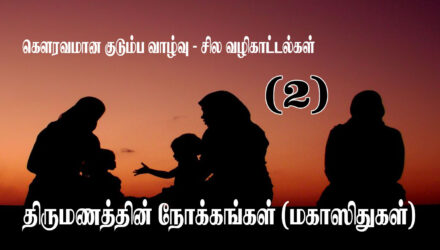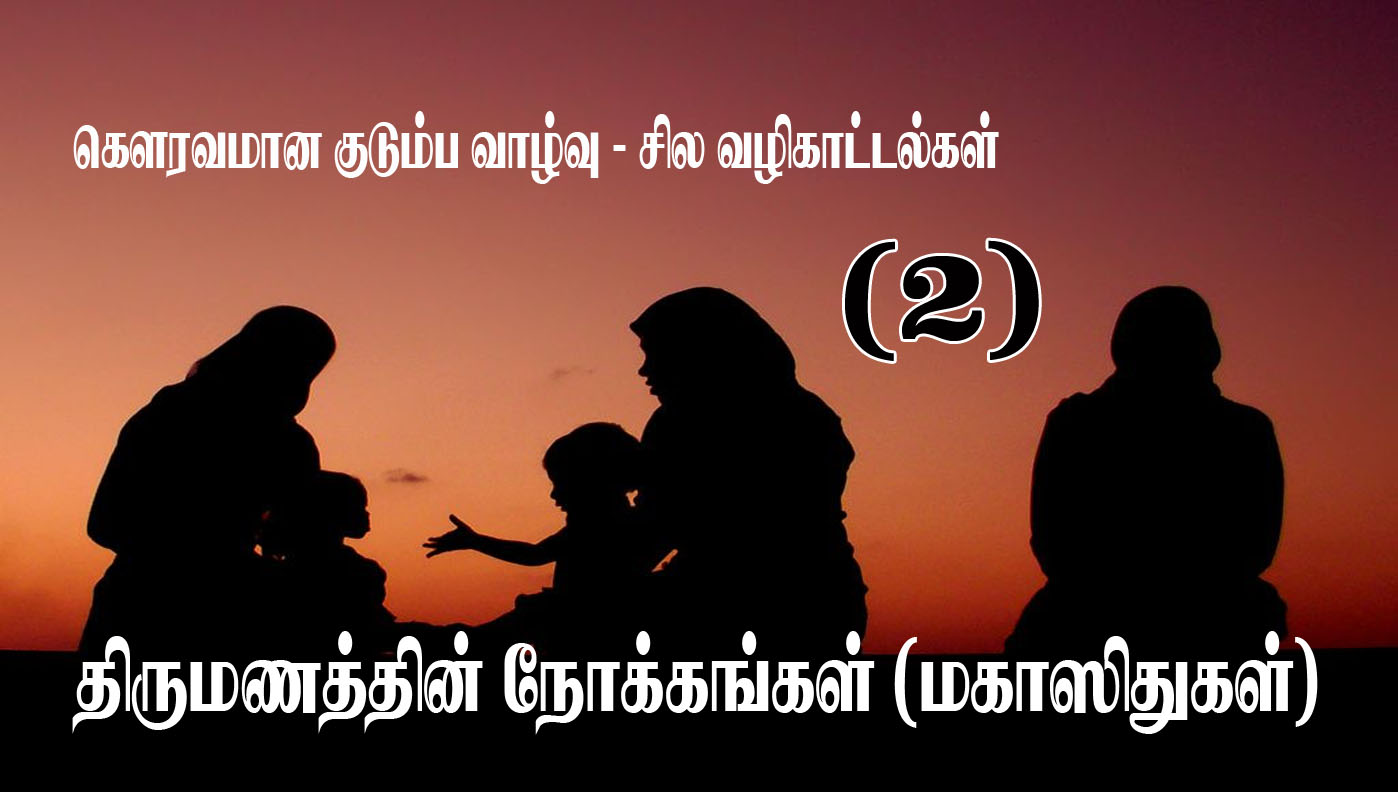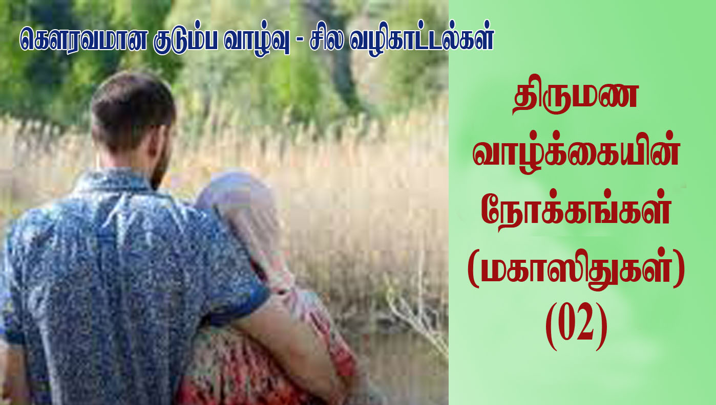 கௌரவமான குடும்ப வாழ்வு – சில வழிகாட்டல்கள் (2) திருமணத்தின் நோக்கங்கள் (மகாஸிதுகள்) அஷ்ஷெய்க் ஆஸாத் அப்துல் முஈத் அல்லாஹுத்தஆலா மனிதனுக்கு வழங்கியுள்ள அனைத்து சட்டங்களிலும் இலக்குகளையும், நோக்கங்களையும் வைத்துள்ளான். இவை மகாஸித் என்று