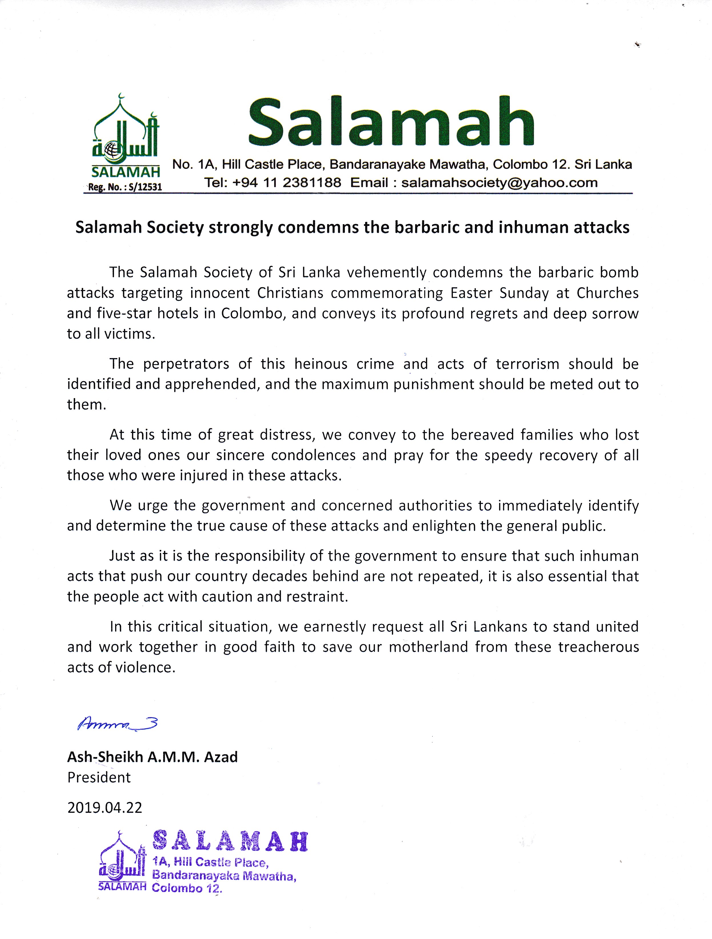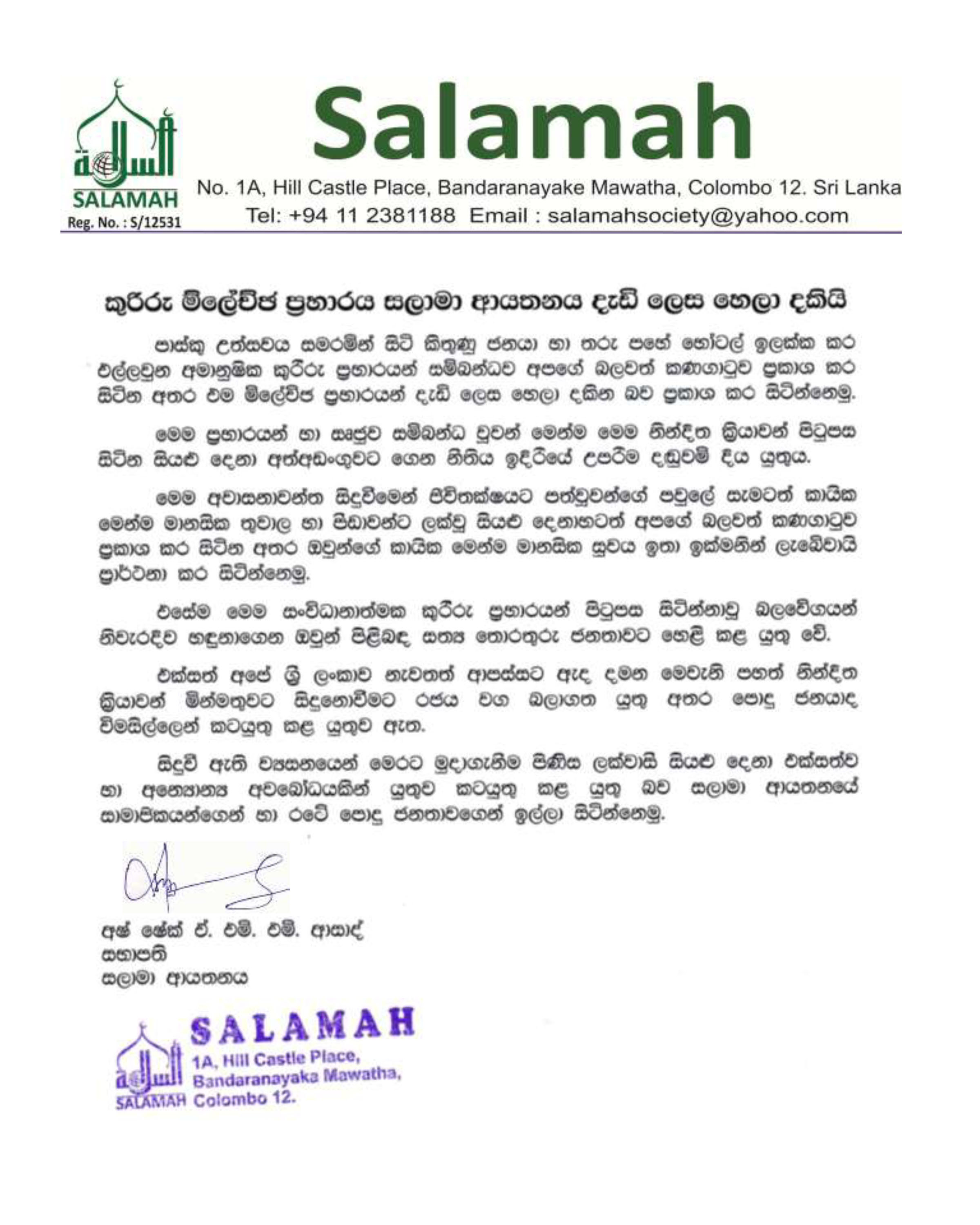 The Salamah Society of Sri Lanka vehemently condemns the barbaric bomb attacks targeting innocent Christians commemorating Easter Sunday at Churches and five-star hotels in Colombo,