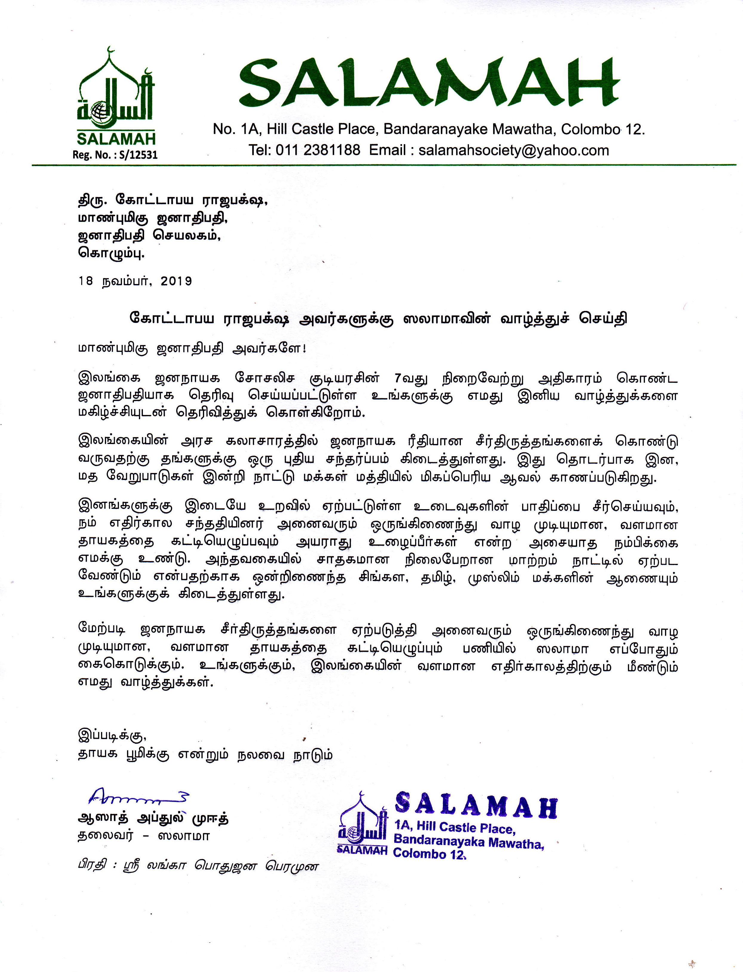 திரு. கோட்டாபய ராஜபக்ஷ, மாண்புமிகு ஜனாதிபதி, ஜனாதிபதி செயலகம், கொழும்பு. 18 நவம்பர், 2019 கோட்டாபய ராஜபக்ஷ அவர்களுக்கு ஸலாமாவின் வாழ்த்துச் செய்தி மாண்புமிகு ஜனாதிபதி அவர்களே! இலங்கை ஜனநாயக சோசலிச குடியரசின் 7வது