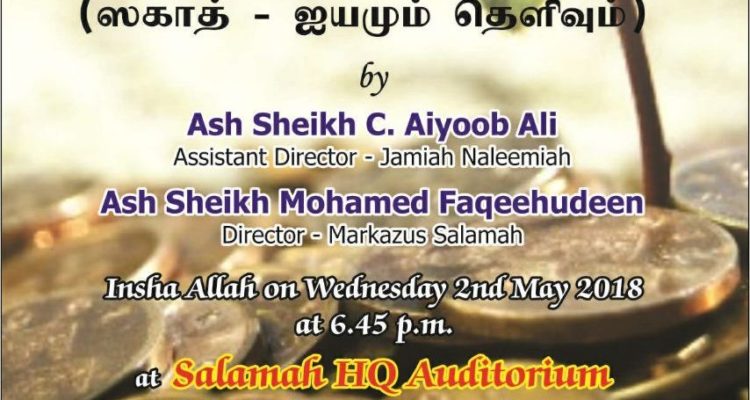 ஸகாத் தொடர்பான ஐயமும் தெளிவும் நிகழ்ச்சி இன்ஷா அல்லாஹ் 02-05-2018ம் திகதி இன்று புதன்கிழமை இரவு 6.45 மணிக்கு ஸலாமா தலைமையக கேட்போர்கூடத்தில் நடைபெறவுள்ளது. இதில் வளவாளர்களாக ஜாமியா நளீமிய்யா உதவிப் பணிப்பாளர் அஷ்ஷெய்க் ஸீ. ஐயூப் அலி அவர்களும் மர்கஸுஸ் ஸலாமா பணிப்பாளர் அஷ்ஷெய்க் பகீஹுத்தீன் முஹம்மத் அவர்களும் கலந்து கொள்ளவுள்ளனர். அனைவரும் கலந்து கொண்டு பயன்பெறுமாறு அன்புடன் அழைக்கின்றோம்.